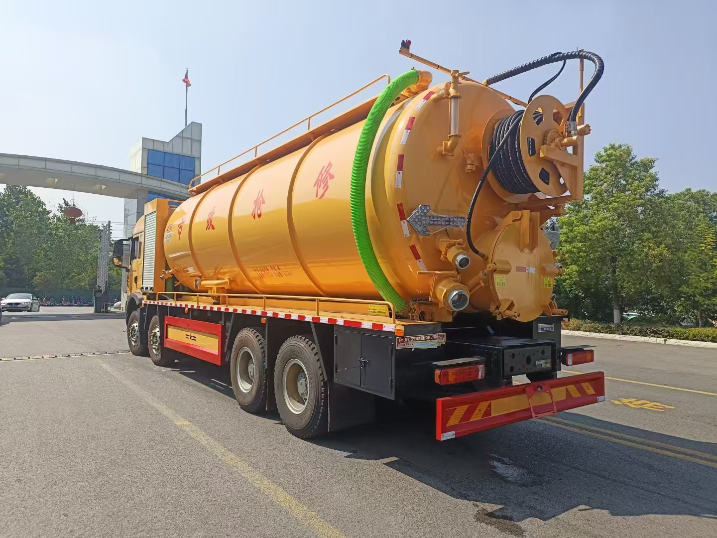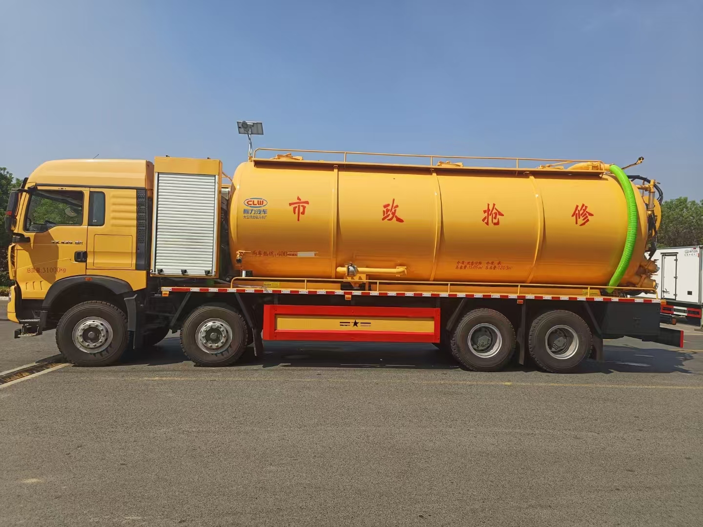 | 上裝配置 | 罐體總容積約33立方,清水箱約10立方,其余為污水罐,加強大架,兩倉互通,采用8mm碳鋼制作,吸污部分,副發采用420馬力配258水循環泵,8米吸污管,罐體兩側加寬平臺加護欄,后部開一個600mm液壓開啟排污口,一個150排污球閥,和一個100的排污球閥,100內抽球閥,后部左右各一個箭頭燈,配品浮350流量,配100米內徑25定制耐磨高壓管,帶卷盤,卷盤液壓左右旋轉。 | ||